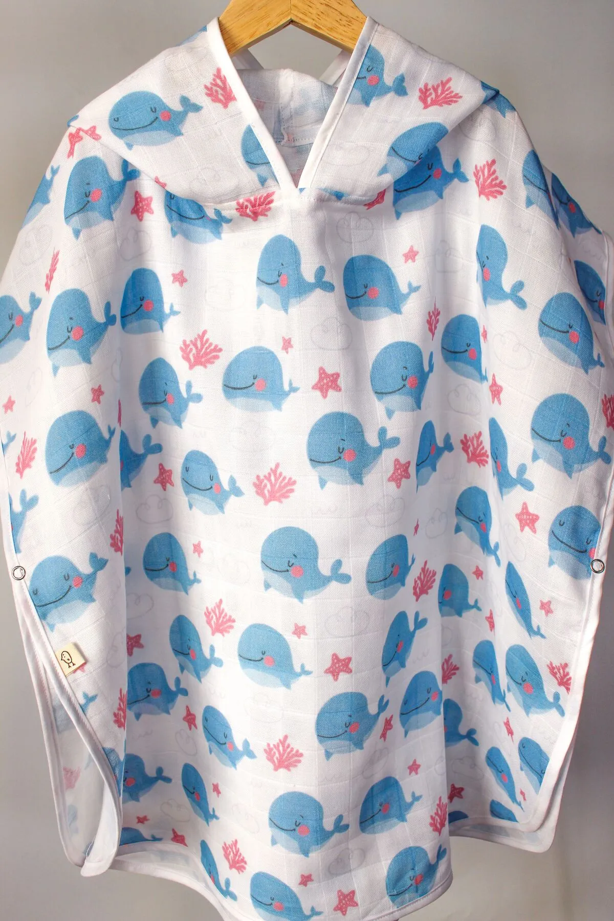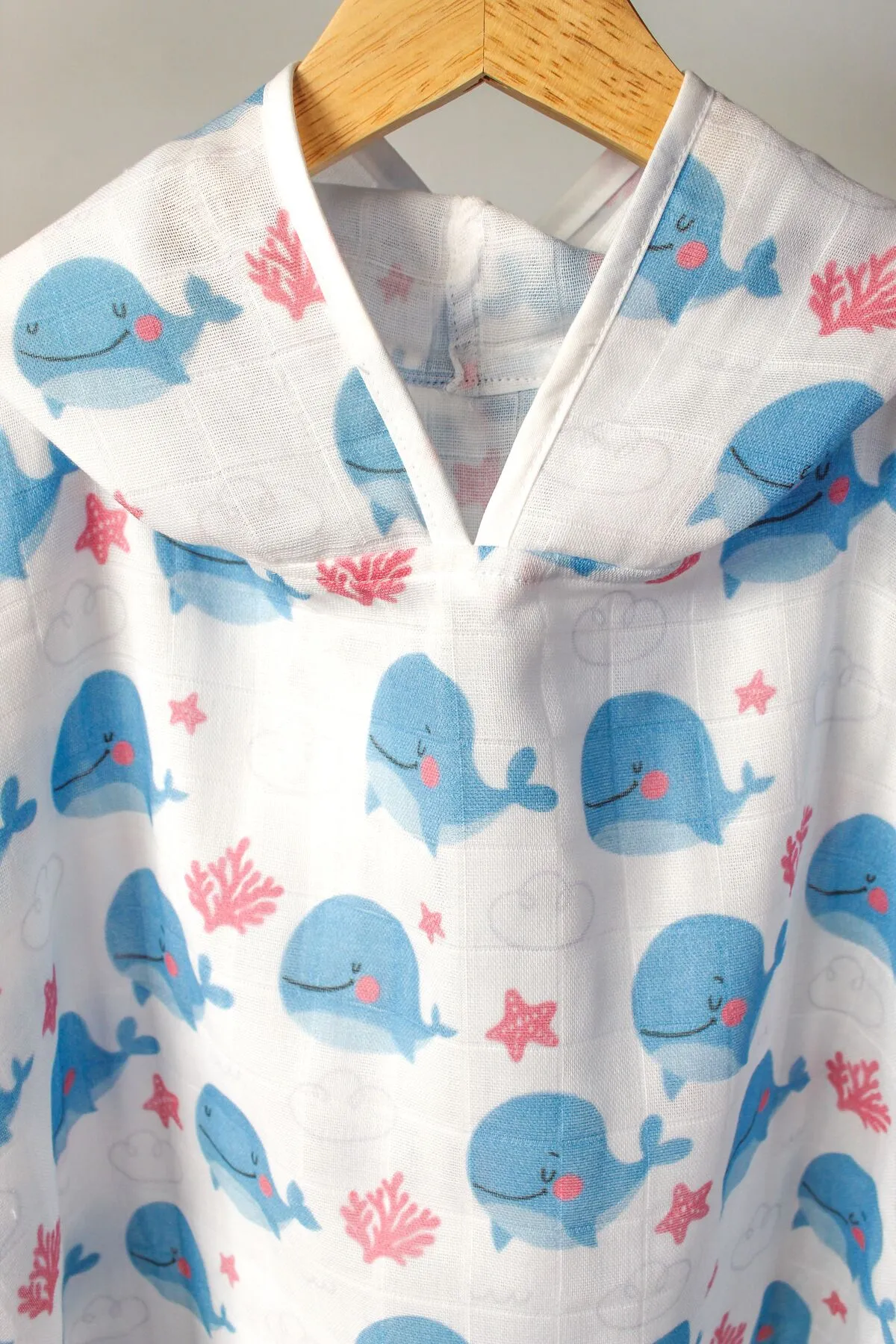 %100 Pamuklu Çift Katlı Organik Bebek Müslin Panço Balina Desenli / Havlu / Bornoz / Deniz