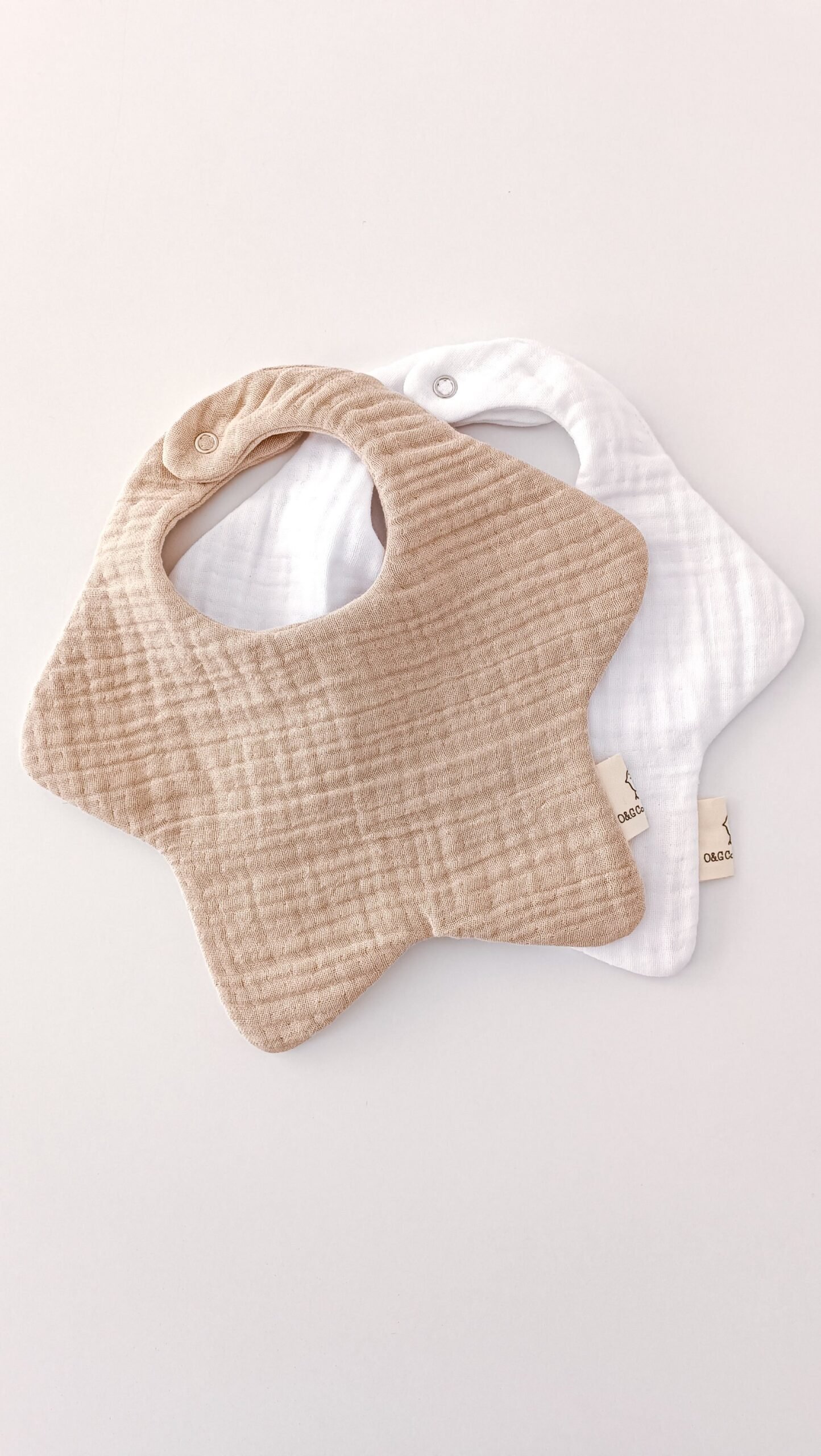 2’li Yıldız Kum Beji-Beyaz % 100 Pamuklu Organik 8 Katlı Müslin Bebek Salya Önlüğü / Mama Önlüğü /Nikel Free Çıtçıt