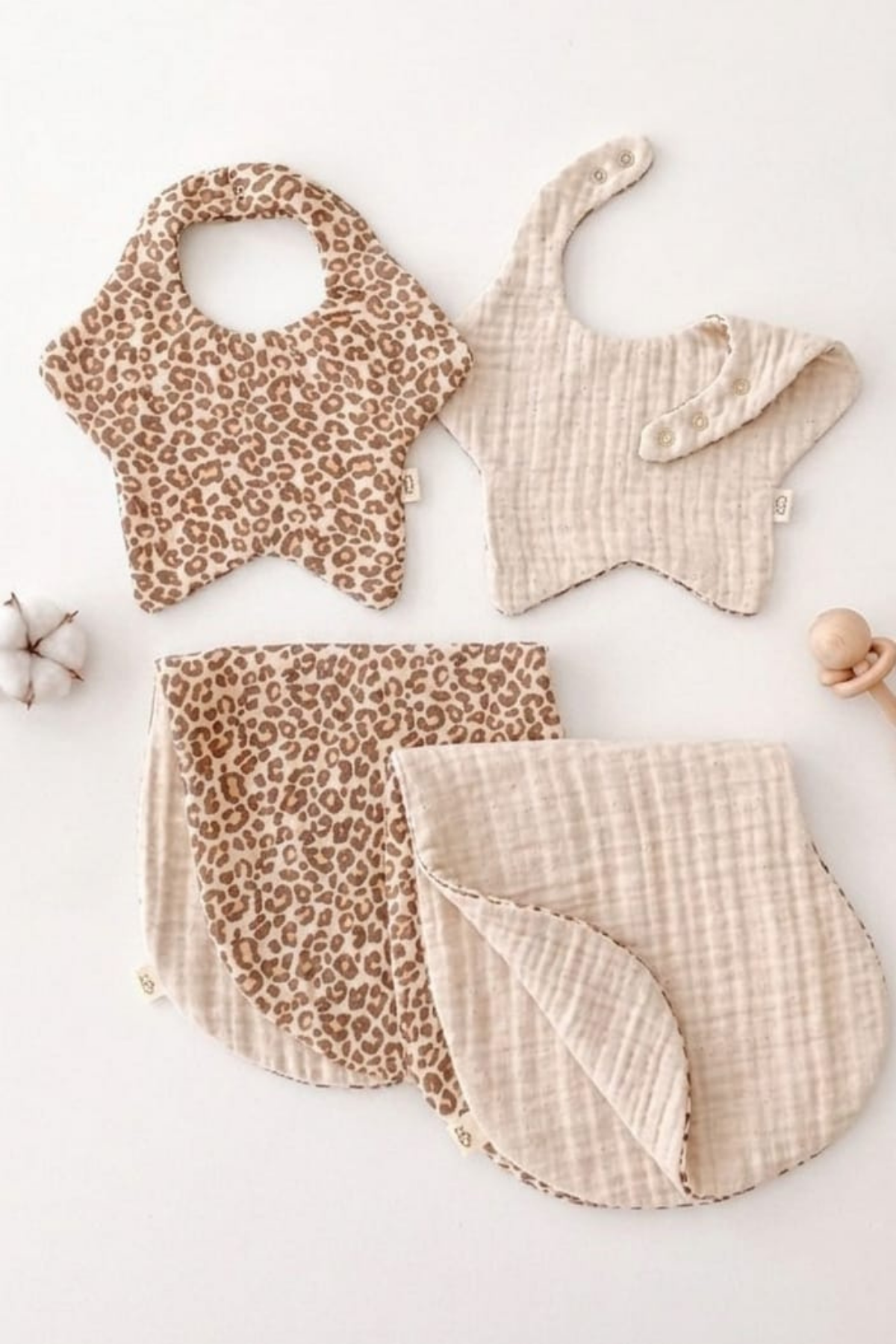 4’lü Leopar & Yıldız %100 Pamuklu 8 Katlı Müslin Bebek Salya Önlüğü ve Omuz Örtüsü Seti