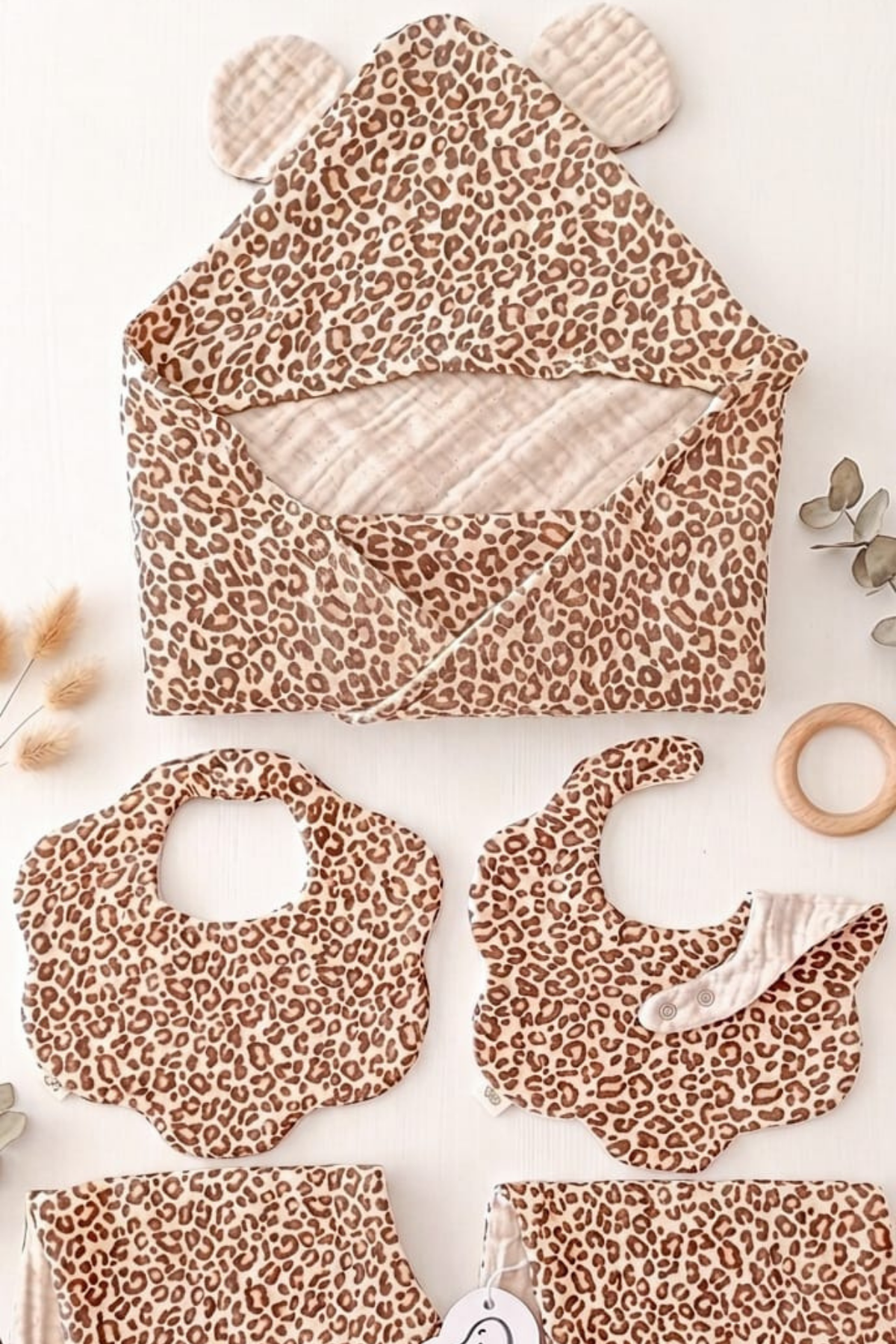 Premium Leopar 5’li Set %100 Pamuklu Multi Müslin Bornoz / 8 Katlı Önlük – Omuz Örtüsü / Nikel Free