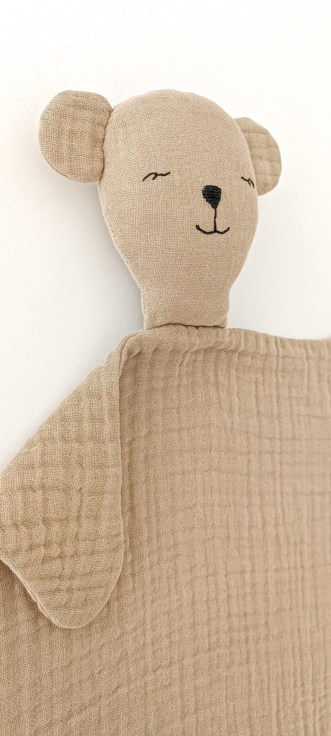 Sevimli Ayıcık %100 Pamuklu 8 Katlı Müslin Uyku Arkadaşı, bebeğinizin hem uyku hem de oyun saatlerinde yanında olacak sevimli bir dost. Nefes alabilen 8 katlı müslin kumaşıyla tamamen doğal ve sağlıklı bir yapıya sahip olan bu ürün, bebeklerin hassas ciltleriyle uyumludur.